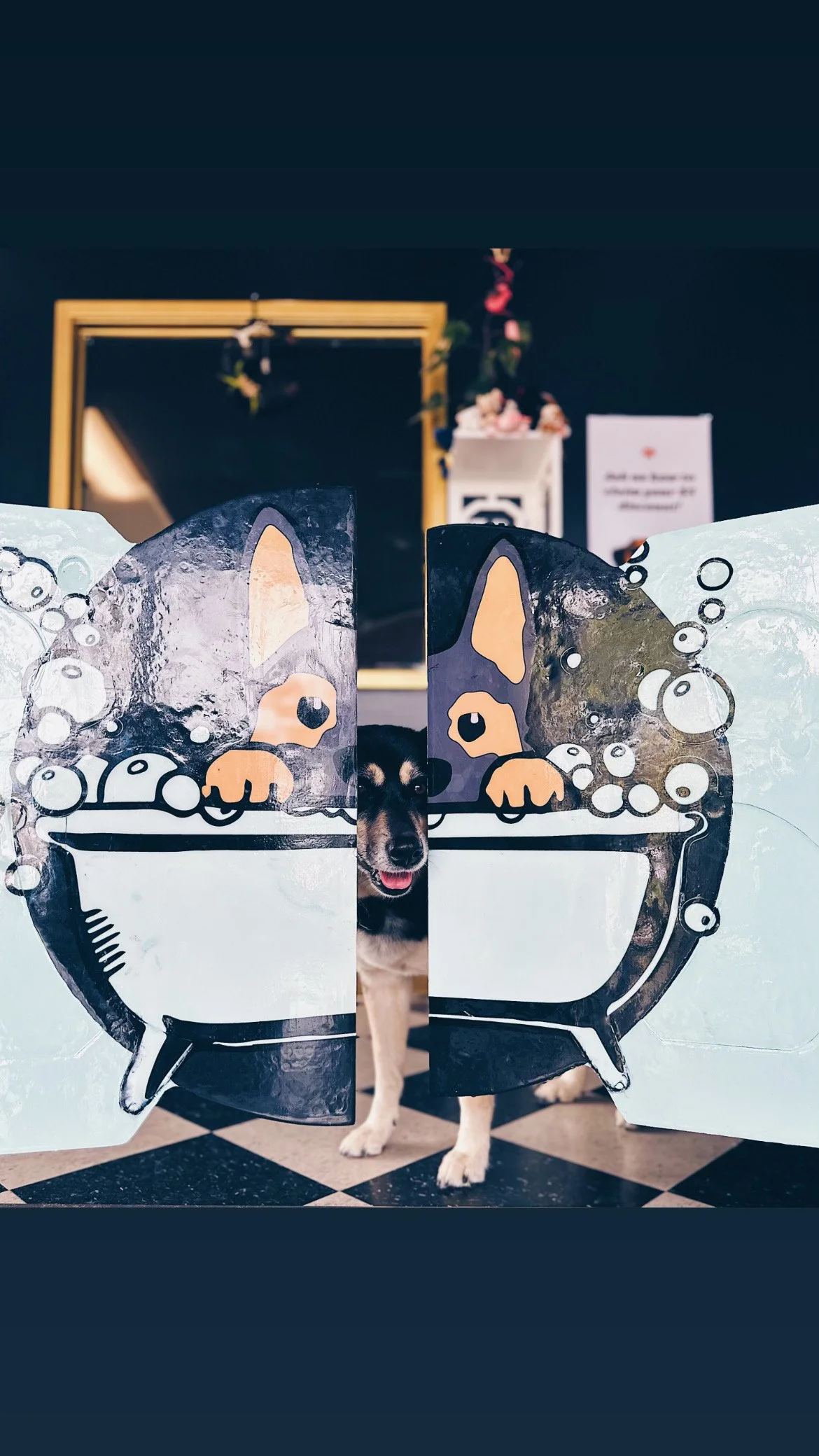 The shop also has a dog on staff(pictured above with our old logo) who is here to support our grooming environment. She helps ease anxiety and behavioral challenges in other dogs by creating a calm and balanced space. She has taken it upon herself to alert me when a dog is too stressed to continue grooming or if they are acting up— ensuring safety and comfort at all times.
